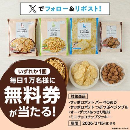 毎日1万名に(お持ち帰り限定)無料引換券をプレゼントするキャンペーン。今回は「対象のローソンオリジナル菓子4種類」が対象です!