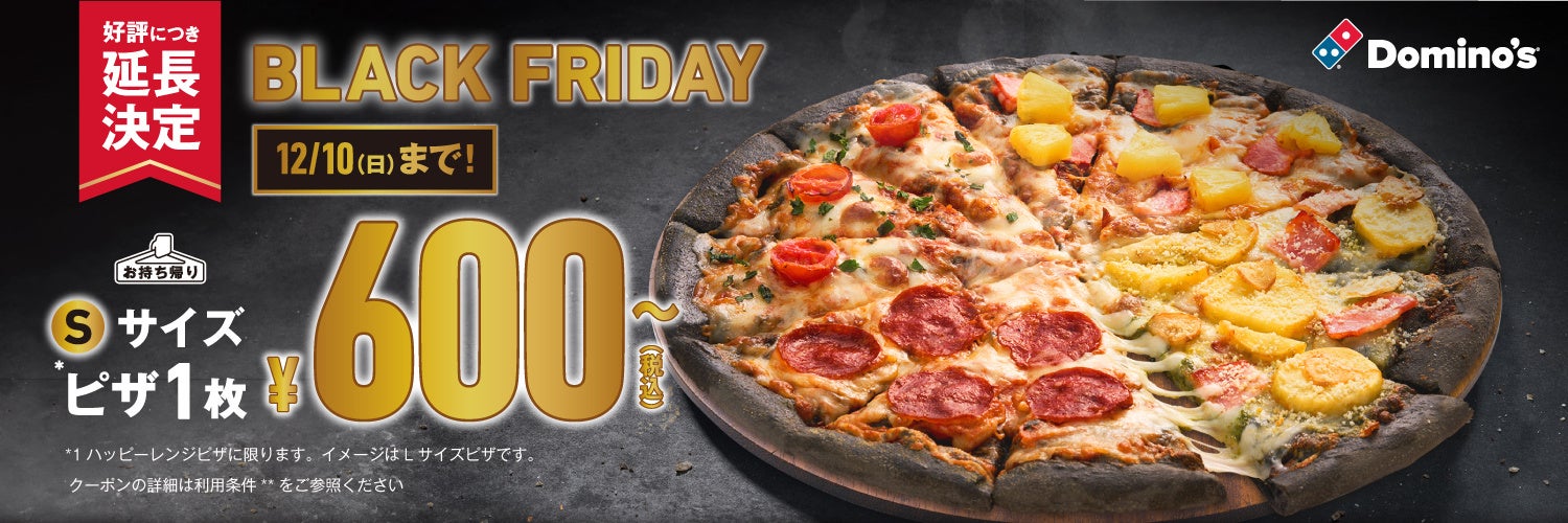 ドミノ・ピザならまだ間に合う!衝撃の60%OFF!最大2,830円おトクに! ブラックフライデーセール大好評につき12月10日まで延長! 嬉しくて、記念に生地を黒くしちゃいます