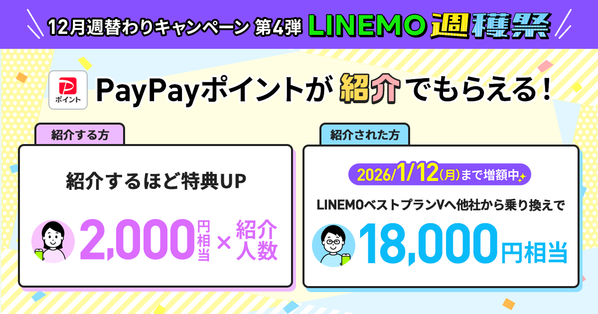 キャンペーン期間中にLINEMOを紹介すると、1回線2,000円相当のPayPayポイントをプレゼント。さらに紹介上限無制限。紹介された方はLINEMOに他社から乗り換えで最大18,000円相当、新しい番号で契約で最大15,000円相当のP...