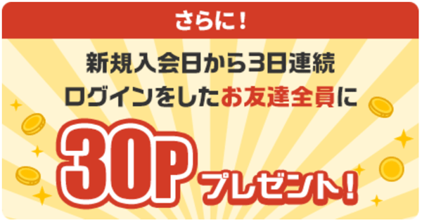 さらに!新規入会日から3日連続ログインをすると全員30Pプレゼント!