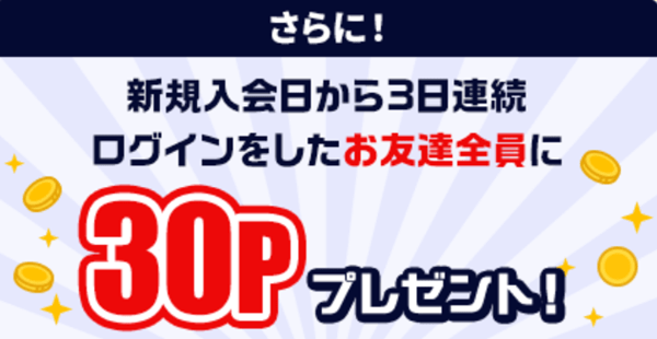 さらに!新規入会日から3日連続ログインをすると30P(30円相当)プレゼント!