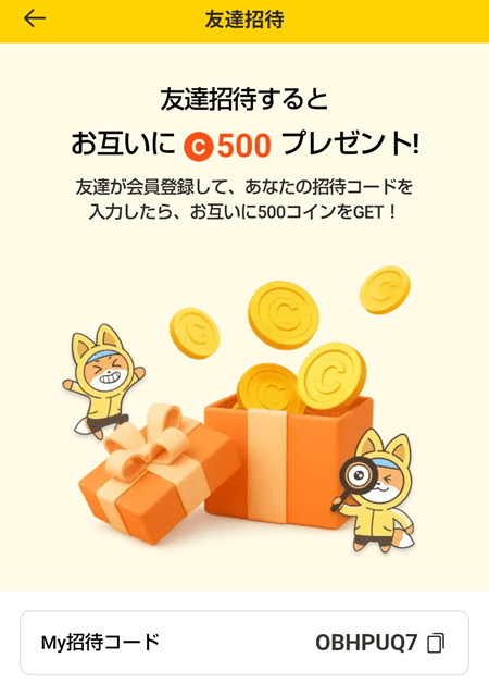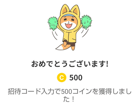 今なら招待コード入力で友達招待キャンペーン特典500コイン(125円相当)GETできます!