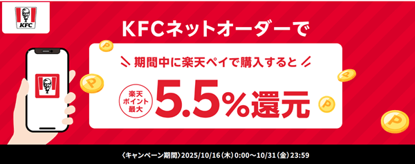 ▼【楽天ペイ(オンライン決済)】KFCネットオーダー エントリー&楽天ペイで購入で楽天ポイント最大5.5%還元キャンペーン開催中です!
