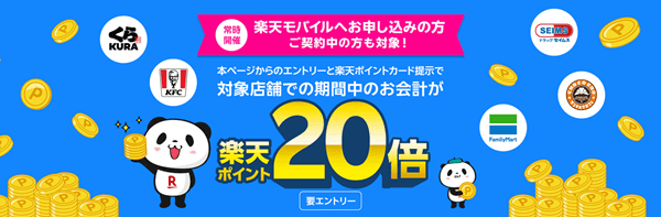 エントリー期間中にエントリーのうえ、キャンペーン期間に楽天モバイルご契約者様が、対象店舗で楽天ポイントカードを提示したお会計に対し、楽天ポイントを通常の20倍進呈いたします。