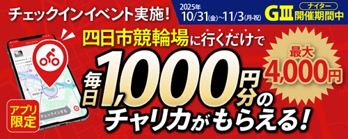 泗水杯争奪戦(G3ナイター)開催中の2025年10月31日(金)~11月3日(月・祝)に四日市競輪場に来場し、チャリロトのアプリでチェックインすると、各日チャリカ1,000円分をプレゼントいたします!毎日チェックインするとなんと最大4,000円GETのチャンスです!!