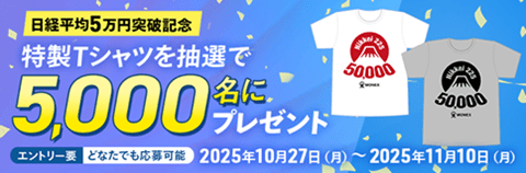 キャンペーンにエントリーされたお客様の中から抽選で5,000名に、日経平均5万円突破記念Tシャツをプレゼントいたします。当キャンペーンはどなたでもご応募いただけます。