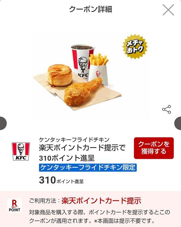 ※KFC公式アプリもしくはKFC公式WEBサイトにて楽天ポイントカードを連携のうえKFCネットオーダーを利用した場合も対象となります。
