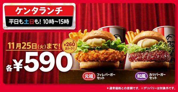 今回、期間限定で「ケンタランチ チキンフィレバーガーセット」と「ケンタランチ 和風チキンカツバーガーセット」の2種を、それぞれ通常価格より260円おトクな590円でご提供します。