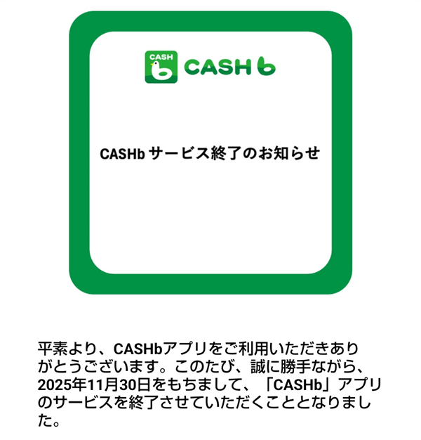 キャッシュバックアプリ「CASHb」がサービス終了します!