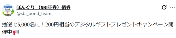 Xアカウント ぼんぐり(SBI証券)(@sbi_bond_team)をフォロー&対象ポストをリポストし、以下の「抽選に参加する」ボタンを押下ください。抽選で5,000名に200円相当のデジタルギフトがその場で当たります。