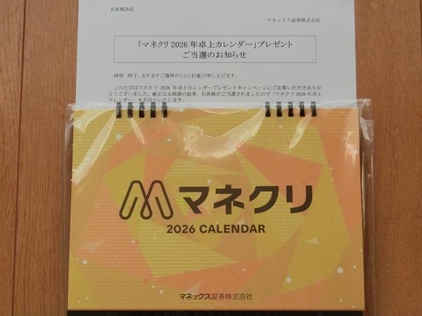 マネックス証券 マネクリ2026年卓上カレンダープレゼントキャンペーンに当選しました!