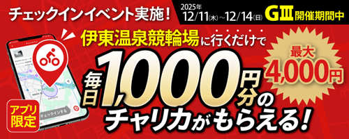 チャリロト【行くだけで最大4,000円分】12/11~12/14 伊東温泉競輪場でチェックインイベント開催!(アプリ限定)