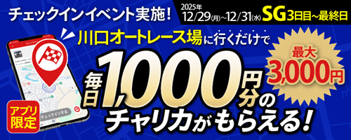 スーパースターフェスタ2025開催中(3日目~最終日)の2025年12月29日(月)~12月31日(水)に川口オートレース場に来場し、チャリロトのアプリでチェックインすると、各日チャリカ1,000円分をプレゼントいたします!毎日チェックインするとなんと最大3,000円GETのチャンスです!!