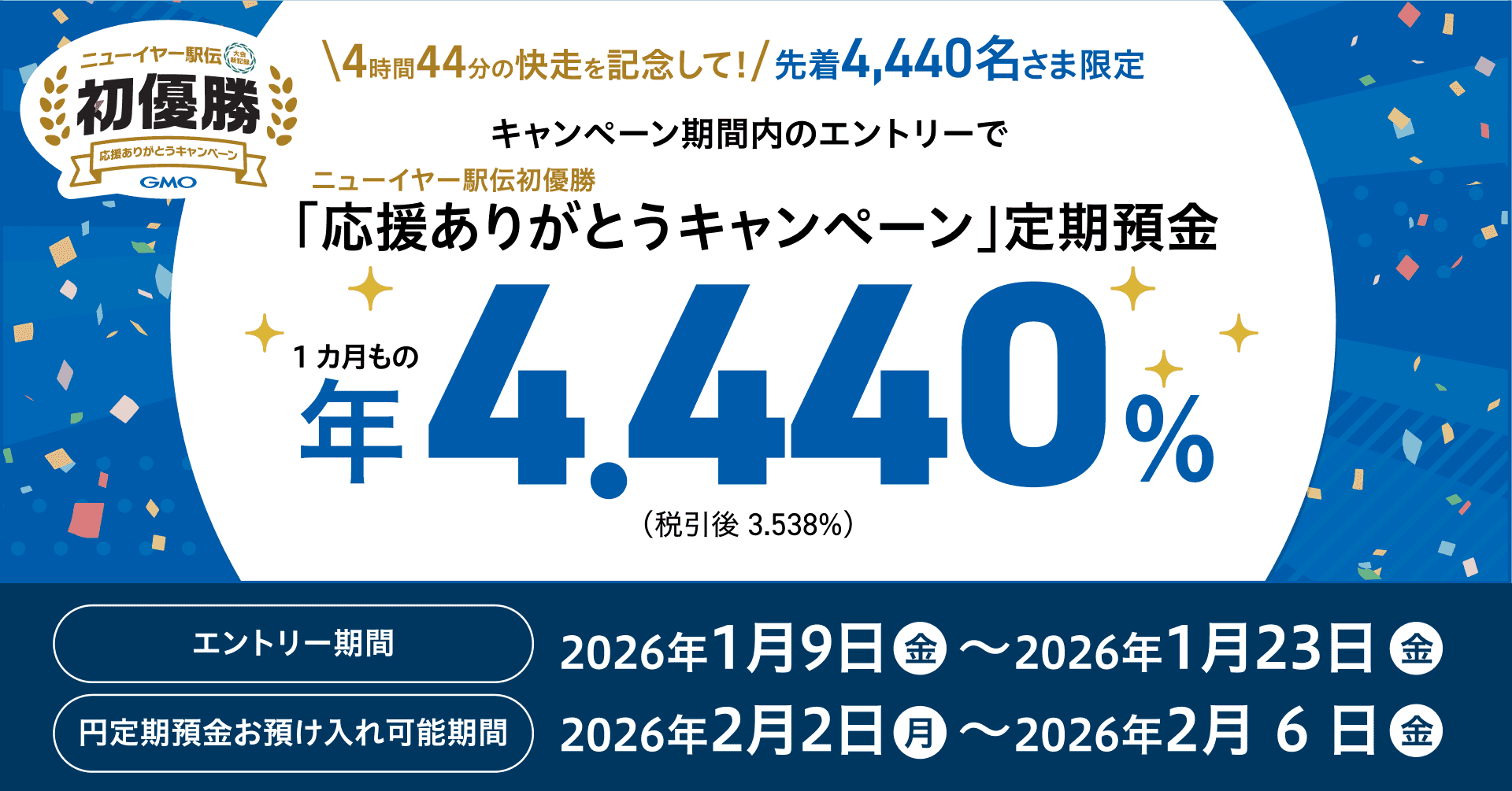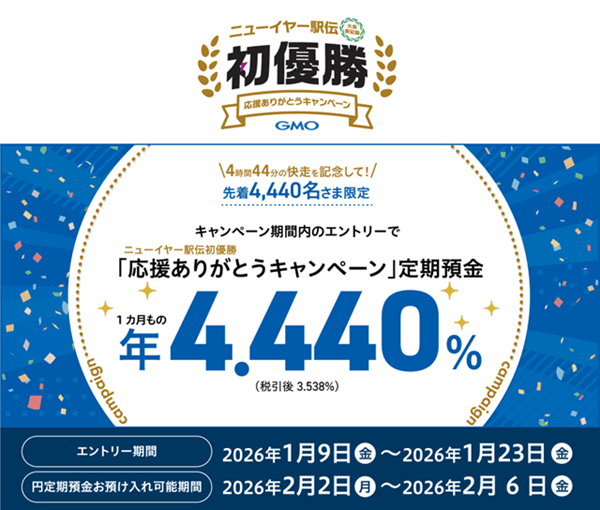 【先着4,440名!!】GMOあおぞらネット銀行 1カ月もの円定期預金 年4.440% ニューイヤー駅伝 初優勝「応援ありがとうキャンペーン」