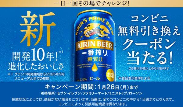 26年1月 キリン一番搾り 糖質ゼロ コンビニ無料引き換えクーポンが当たる!キャンペーン
