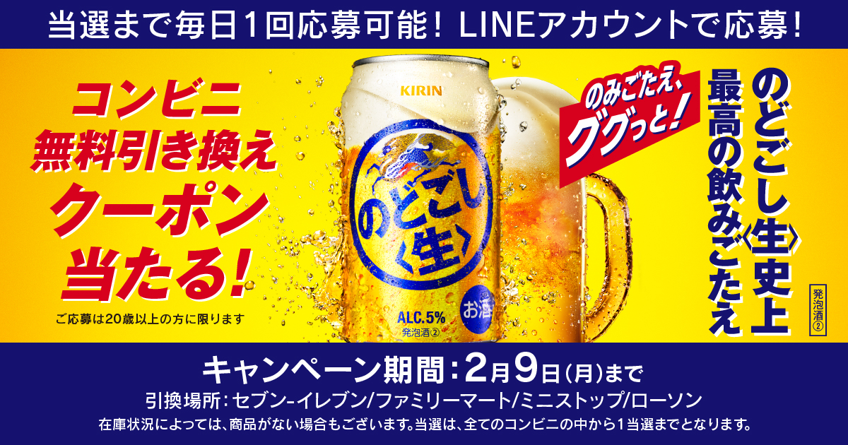 26年2月 のどごし<生> コンビニ無料引き換えクーポンが当たる!キャンペーン