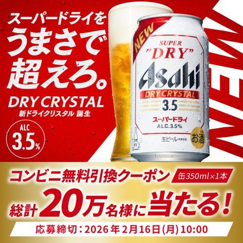 コンビニで『アサヒスーパードライ ドライクリスタル』と無料引換えできるクーポンを200,000名にプレゼントします!