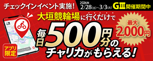 開設73周年記念 水都大垣杯(G3)開催中の2026年2月28日(土)~3月3日(火)に大垣競輪場に来場し、チャリロトのアプリでチェックインすると、各日チャリカ500円分をプレゼントいたします!毎日チェックインするとなんと最大2,000円GETのチャンスです!!※チェックイン可能な時間帯は、毎日9:00から18:00までとなります。