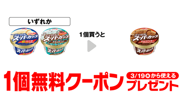 「明治 エッセル スーパーカップ 超バニラ」、「明治 エッセル スーパーカップ チョコミント」いずれか1個買うと、「明治 エッセル スーパーカップ チョコクッキー」1個無料クーポンプレゼント!