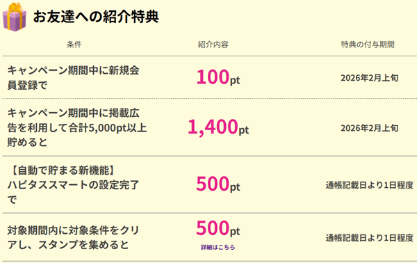 当ブログからハピタスに登録で100円分、キャンペーン期間中に掲載広告を利用して2026年1月31日までに合計5,000pt以上貯めると1,400円分、ハピタススマートの設定完了で500円分、新規会員登録後7日以内にスタンプラリークリアで500円分プレゼント!