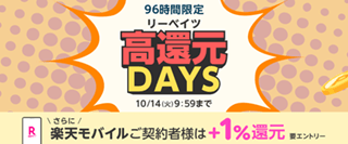 キャンペーン 【96時間限定!!】最大20%還元!リーベイツ 高還元DAYS! 【PR】96時間限定!リーベイツ 高還元DAYS!開催中です!! キャンペーン開催期間:2025年10月10日(金)10:00~2025年10月14日(火)9:59 楽天Rebatesは楽天が運営するポイントサイトです。Rebatesを経由... 2025.10.10 2025.10.12 キャンペーンポイ活Rebates