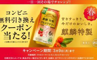キャンペーン 【6.5万名に当たる!!】麒麟特製 アセロラサワー 350ml缶 無料クーポンが当たる!キャンペーン 26年3月 麒麟特製 コンビニ無料引き換えクーポンが当たる!キャンペーン 応募期間:2026年3月3日(火)11:00 ~ 3月9日(月)23:59 まで 一日一回その場でチャレンジ!コンビニ無料引き換えクーポン当たる! ■引き換え対象商品... 2026.03.03 キャンペーンLINE