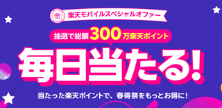 キャンペーン 【楽天モバイル スペシャルオファー】総額300万!抽選で楽天ポイントが毎日当たる!キャンペーン 【楽天モバイル春得祭スペシャルオファー】 総額300万!抽選で楽天ポイントが毎日当たる! キャンペーン期間:2026年3月3日 (火) 10:00~2026年3月15日 (日) 23:59 キャンペーン特典 スペシャルオファー賞品① 特典内... 2026.03.03 キャンペーンポイ活