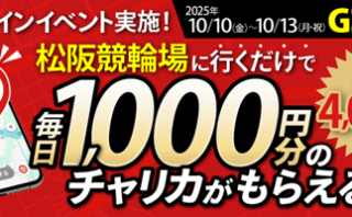 【最大4,000円分もらえる!!】松坂競輪場でチェックインすると毎日チャリカ1,000円分プレゼント!