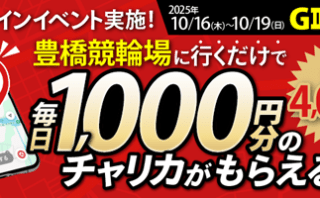 キャンペーン 【最大4,000円分もらえる!!】豊橋競輪場でチェックインすると毎日チャリカ1,000円分プレゼント! 【行くだけで最大4,000円分】10/16~10/19豊橋競輪場でチェックインイベント開催!(アプリ限定) キャンペーン期間:2025年10月16日(木)~10月19日(日) アジア・アジアパラ大会協賛競輪(G3)開催中の2025年10月1... 2025.10.15 2025.10.16 キャンペーンポイ活