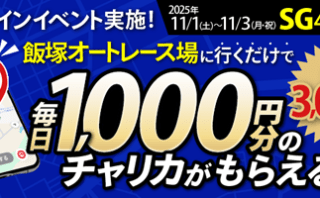キャンペーン 【最大3,000円分もらえる!!】飯塚オートレース場でチェックインすると毎日チャリカ1,000円分プレゼント! チャリロト【行くだけで最大3,000円分】11/1~11/3 飯塚オートレース場でチェックインイベント開催!(アプリ限定) キャンペーン期間:2025年11月1日(土)~11月3日(月・祝) 第57回日本選手権オートレース(SG)開催中(4... 2025.10.24 2025.10.26 キャンペーンポイ活