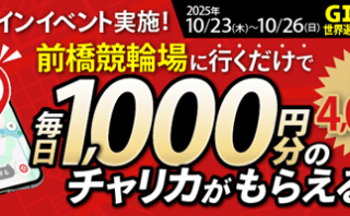 キャンペーン 【最大4,000円分もらえる!!】前橋競輪場でチェックインすると毎日チャリカ1,000円分プレゼント! 【行くだけで最大4,000円分】10/23~10/26前橋競輪場でチェックインイベント開催!(アプリ限定) キャンペーン期間:2025年10月23日(木)~10月26日(日) G1開催中の2025年10月23日(木)~10月26日(日)に前... 2025.10.20 キャンペーンポイ活